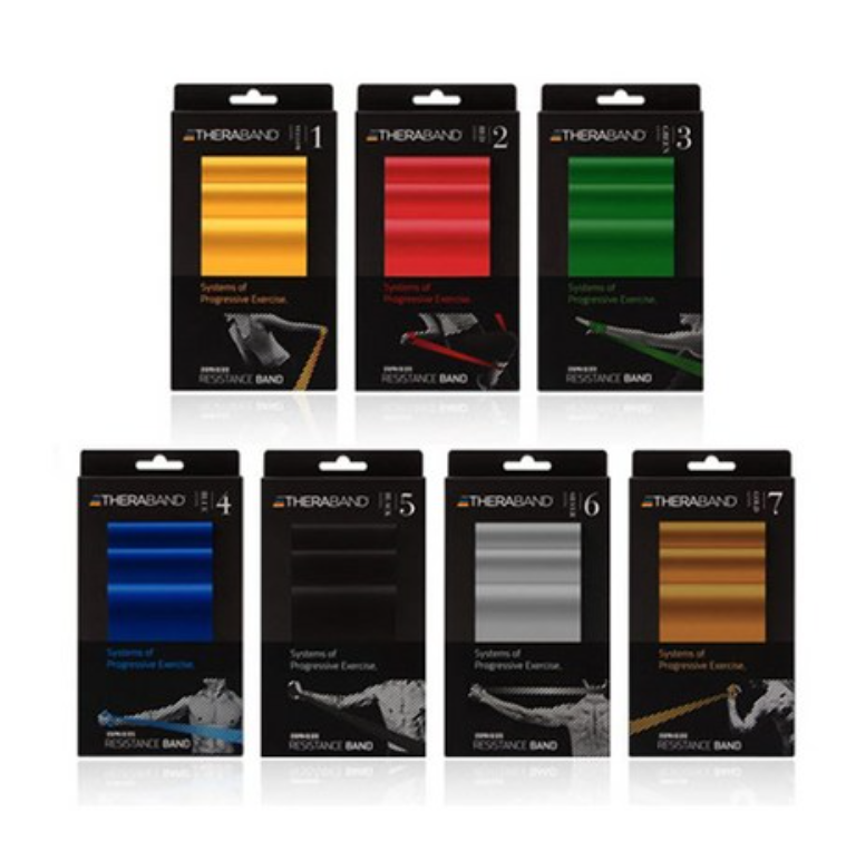 제가 병원에서 사용하고 있는 세라밴드입니다. 탄성있는 고무밴드로 색상마다 고무밴드의 탄성이 다르며 수술 이후의 연세가 많으신 환자분은 2단계 강도인 붉은색이나 3단계 강도인 초록색을 추천합니다.
