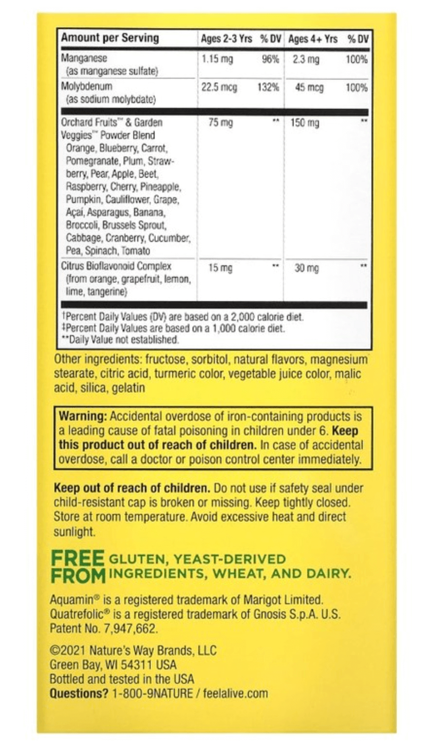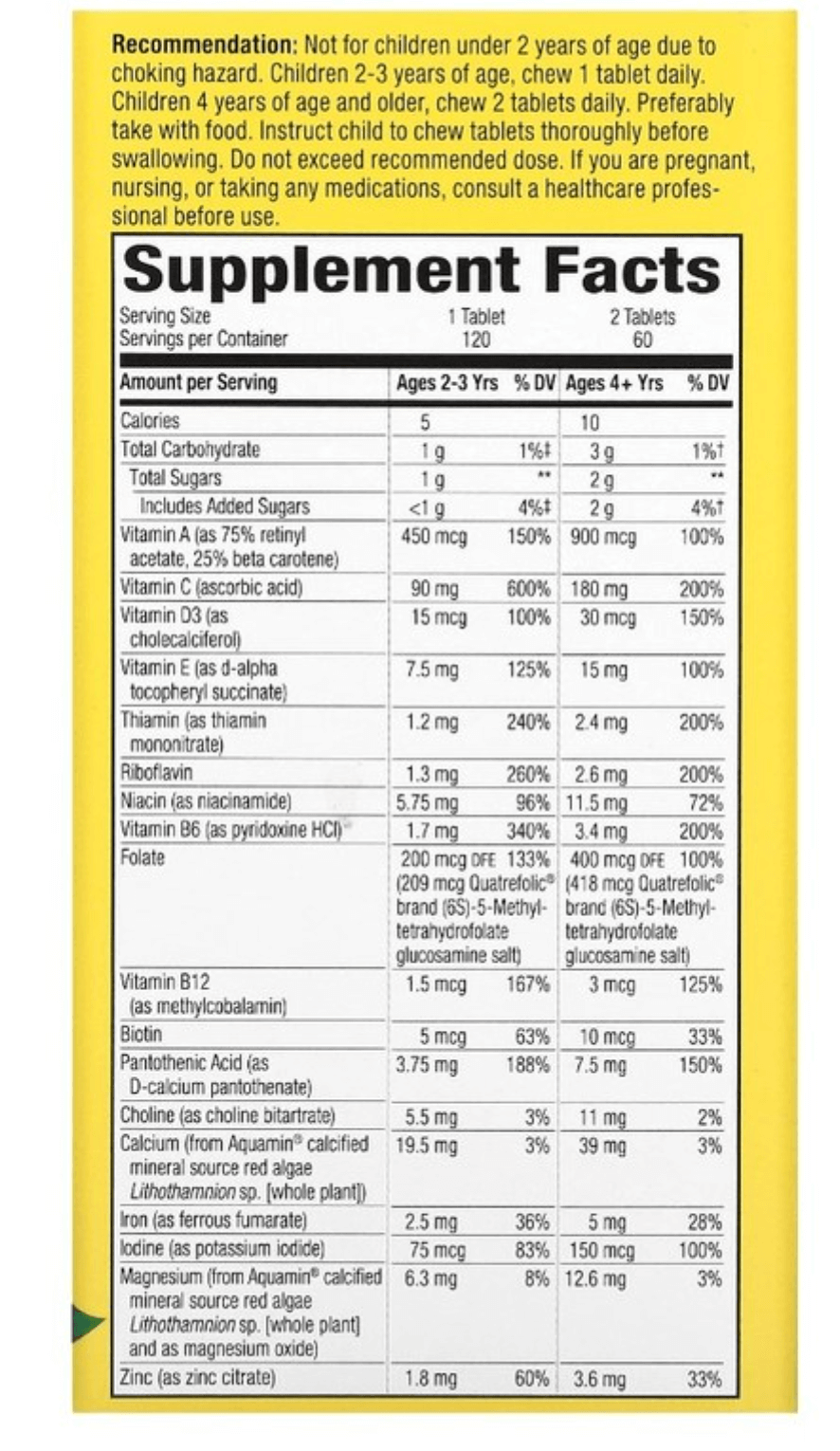 4세 이상의 어린이가 먹을 수 있는 씹어먹는 츄어블 형태의 비타민입니다. 츄어블 형태의 제품들의 함량이 낮은데 상당히 높은 함량으로 활성형 엽산까지 다양하고 좋은 구성으로 나온 비타민입니다.