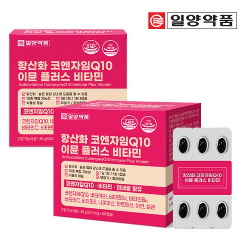 일양약품에서 출시된 코큐텐 역시 일 최대 섭취량인 100mg가 함유되어 있고 순도 99% 이상의 미국산 프리미엄 코엔자임 성분으로 중국산과 일본산 원료를 배제하였고, 소화가 잘 되는 식물성 캡슐입니다. 이 또한 크기가 작고, 첨가물이 들어가지 않아 믿을 수 있는 제품입니다. B1, B2, B6, 비타민C, E, 판토텐산, 나이아신, 아연, 셀렌등의 성분으로 면역기능과 에너지 대사에 중점을 둔 제품입니다.