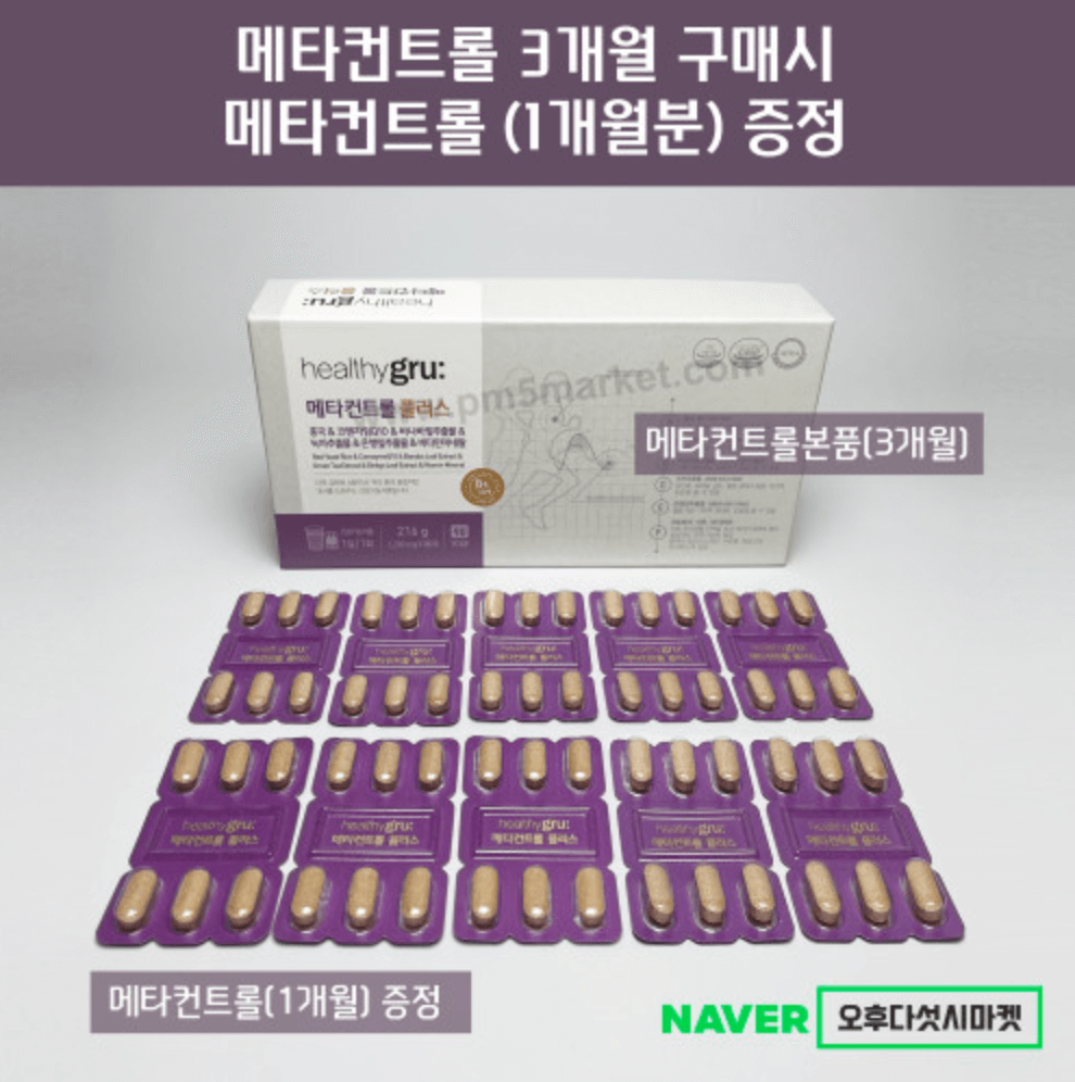 헬시그루의 메타컨트롤 플러스 역시 홍국과 복합기능성 원료가 함께 함유되어 있습니다. 1일 권장량인 4mg의 홍국과, 300mg의 카테킨, 100mg의 코큐텐, 바나바잎 0.45mg, 은행잎 28mg가 함유되어 있습니다. 현재 3개월치를 구매하시면 1개월치를 추가 증정하는 이벤트 중입니다.
