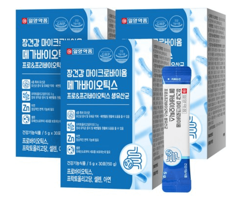 일양약품의 메가 바이오틱스는 특허받은 신바이오틱스가 함유되어 있습니다. 신바이오틱스란 살아있는 유산균 및 유산균의 먹이가 함께 포함되어 있는 성분으로 유익균은 늘려주고, 유해균을 줄여주는 역할을 해 그 효과가 더욱더 좋습니다. 배변활동이 원활하지 않은 분, 앉아있는 시간이 많은 분, 식사가 불규칙한 분, 임산부, 가스가 자주 차고 배변이 힘든 어르신, 평소 장 건강을 관리하고 싶은 분들 모두 미리 복용하시면 장건강을 튼튼하게 하는데에 도움이 됩니다.