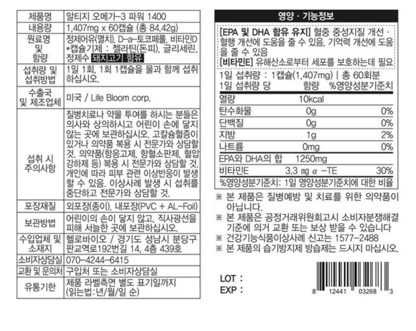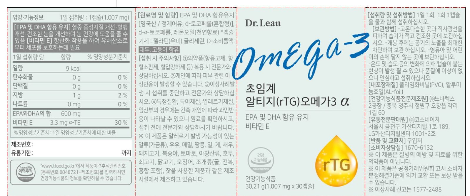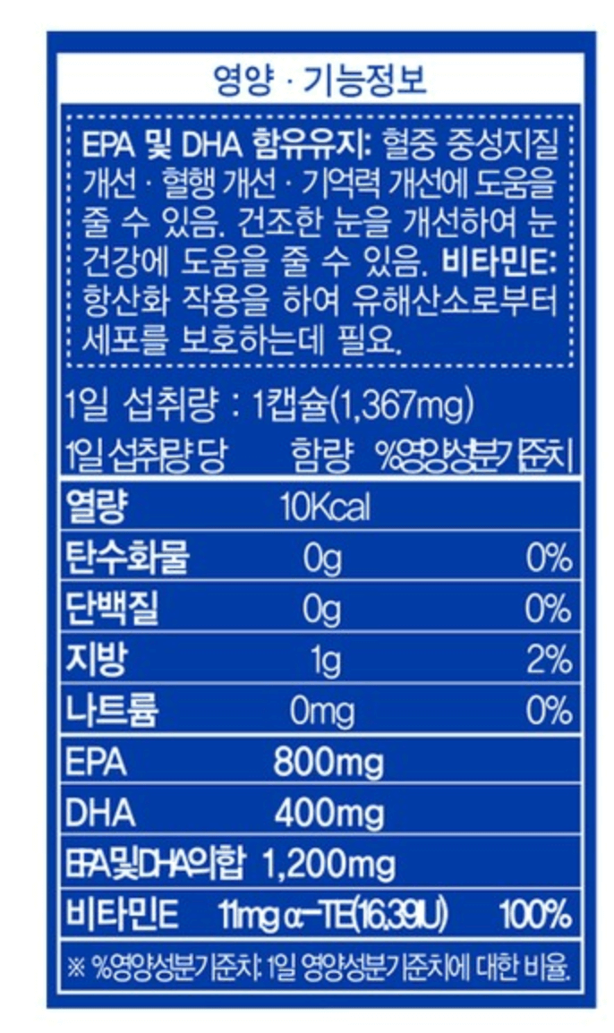1 캡슐 1,007mg 용량에 포함된 EPA와 DHA의 합이 600mg로 순도 60%의 제품입니다. 비타민 E도 함께 함유하고 있는 좋은 제품이네요. 국내에서 인기가 많고 가성비가 좋은 제품입니다.